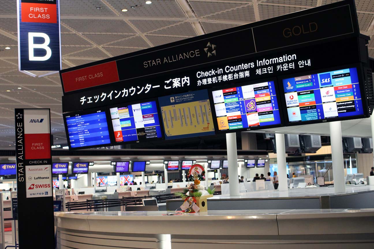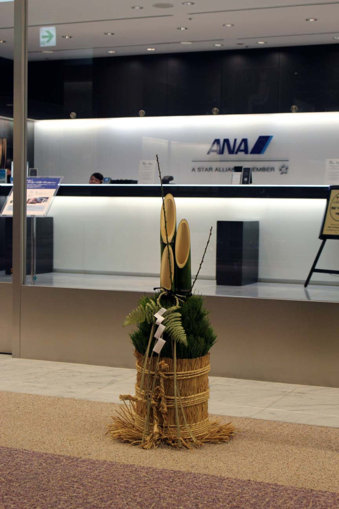 年末の成田空港は思った程の混雑はなく、鏡餅や門松が季節感を出している。