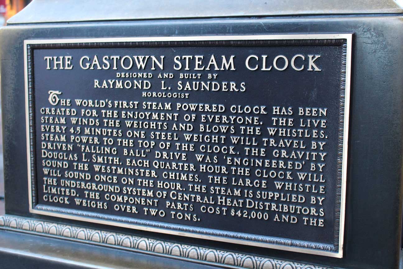元々は、バンクーバーの蒸気暖房システムの蒸気口を隠すための装飾要素として作られたもので、世界でも稼働している数少ない蒸気時計の一つだそうだ。