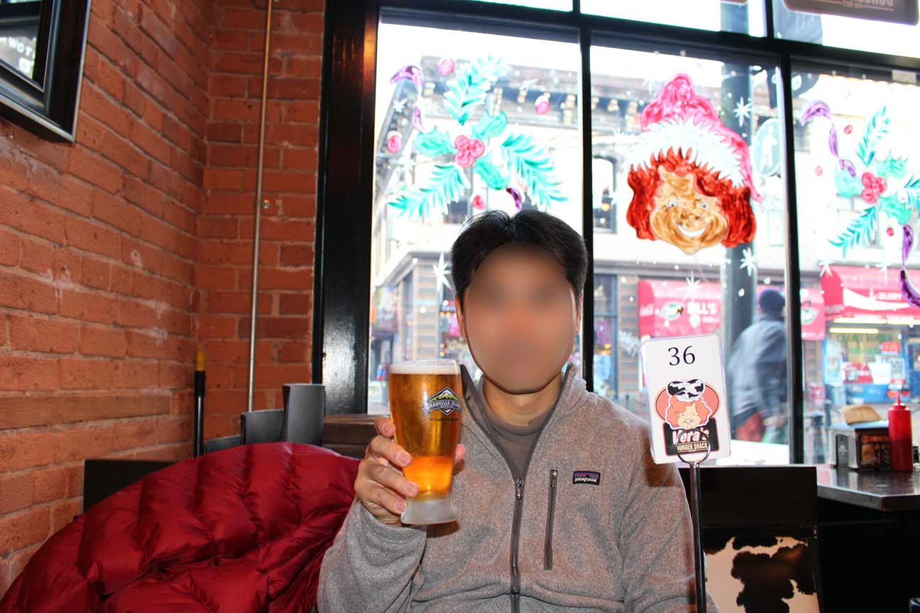 ビールで乾杯をしてハンバーガーを頬張る。
