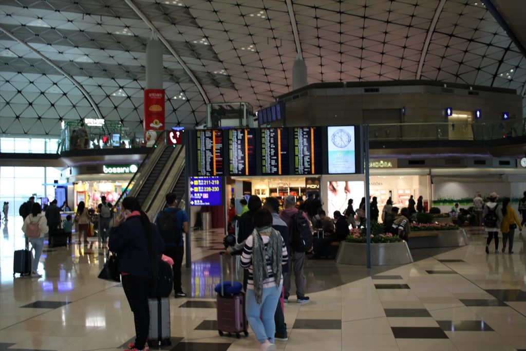 空港では、フライトを確認し、すぐにチェックインシテ荷物を預けて身軽になる。