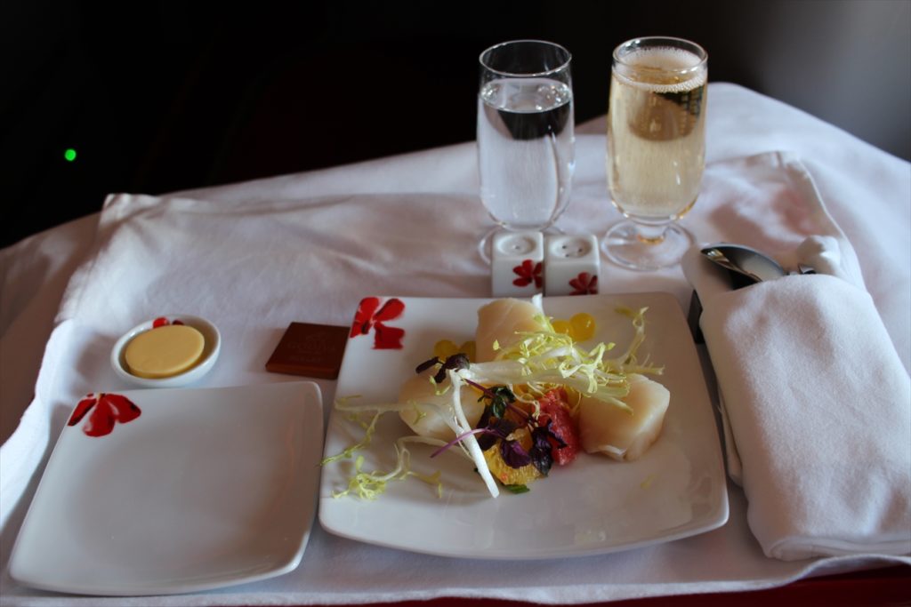 まずはシャンパンを飲みながら、前菜のホタテを頂く。