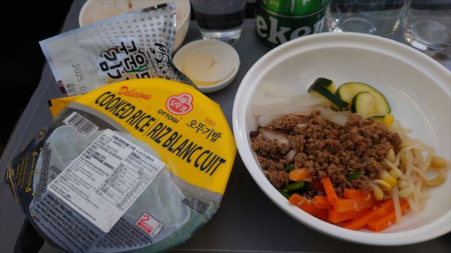 離陸前にリクエストを聞かれたので、ソウル発ということもありビビンバにした。