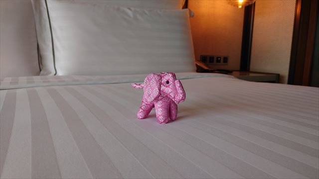 真っ白なシーツの上にはコンラッド バンコク名物のピンクのゾウが!