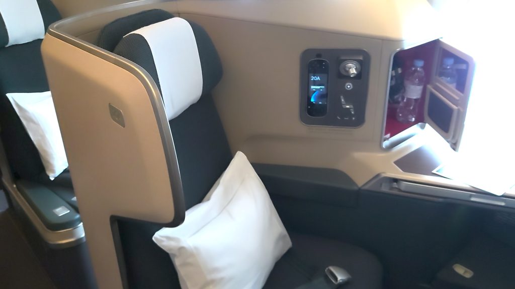 キャセイのHPによれば「調節可能な照明、広いテーブル、電源コンセント、ボタン1つで設定できるリクライニングシート」とあるようにとても快適だ。