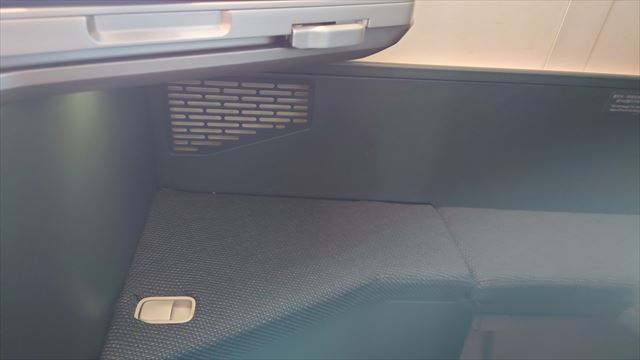 ヘッドフォンとエビアンの入っていた収納スペース内には扉部分に鏡と小物入れようのネットがあり、内部にはユニバーサル電源とUSB端子があり充電ができる。