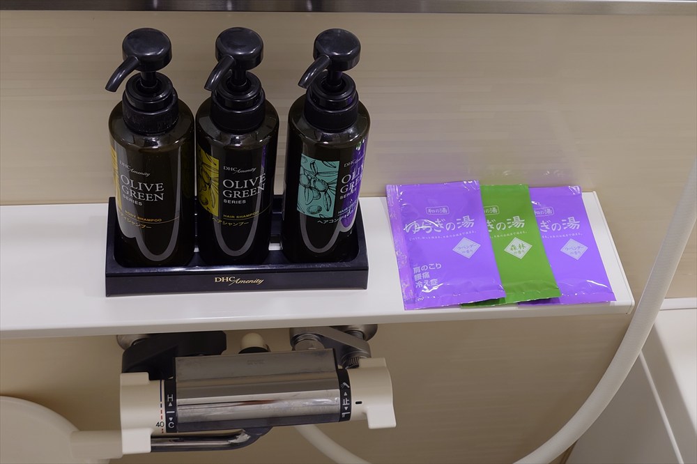 ボディシャンプー、シャンプー、リンスと入浴剤もそろっている。