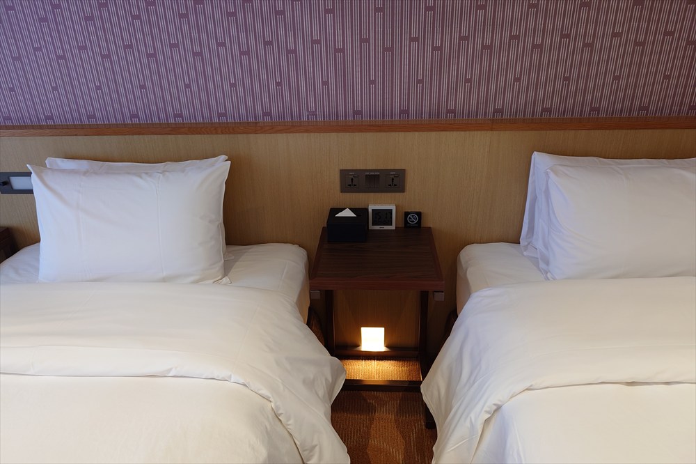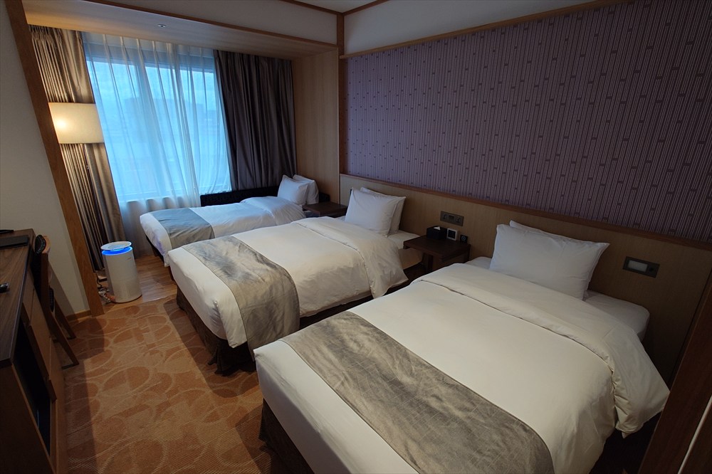 部屋は25㎡ のツインルームで2 シングル (195cm*110cm) +1 ソファベッド (192cm*92cm)となっている。
