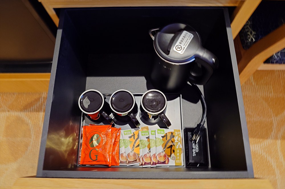 引き出しには電気ケトルとカップ、コーヒーや紅茶が入っている。