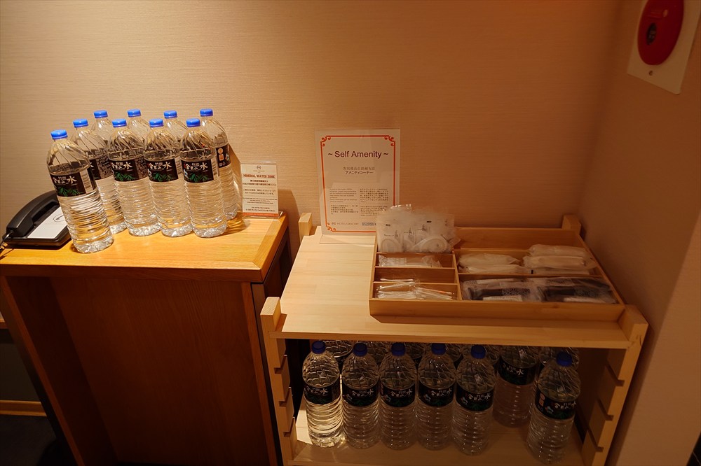また、廊下にアメニティとペットボトルの水が大量に置いてあった。