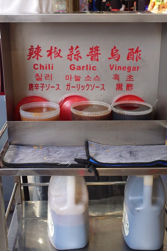 日本人好みの優しい味だが、お好みで唐辛子ソース、ガーリックソース、黒酢で味変できる。