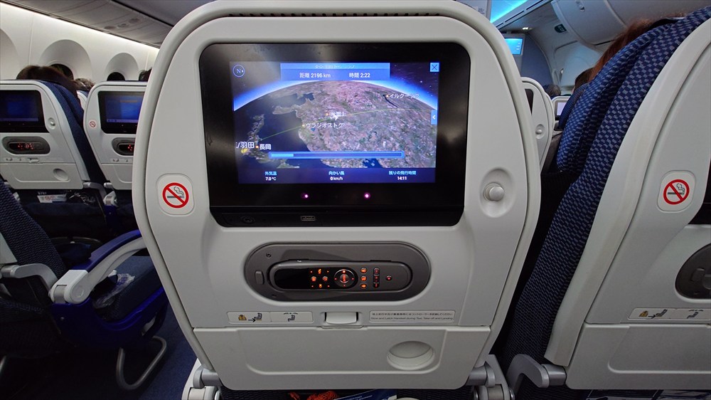 当初、画面上では通常のシベリアルート(ロシア上空通過)が表示されていたが、「実際とは異なります」との放送があった。