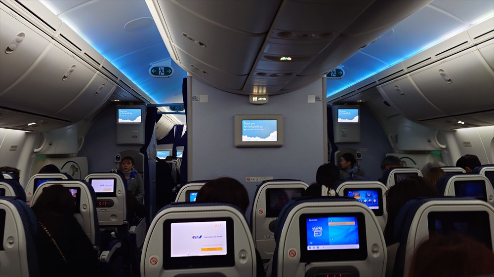 機内食を食べ終えると照明が消されて多くの乗客は眠りに落ちる。