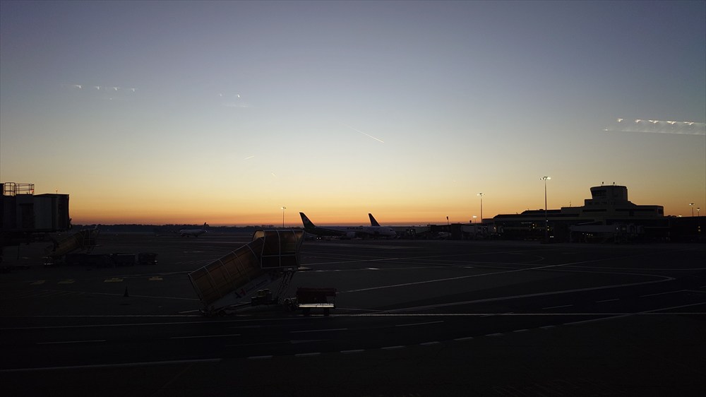 冬のヨーロッパは日の出も遅く、着陸態勢に入ってやっと外が赤く染まってきた。