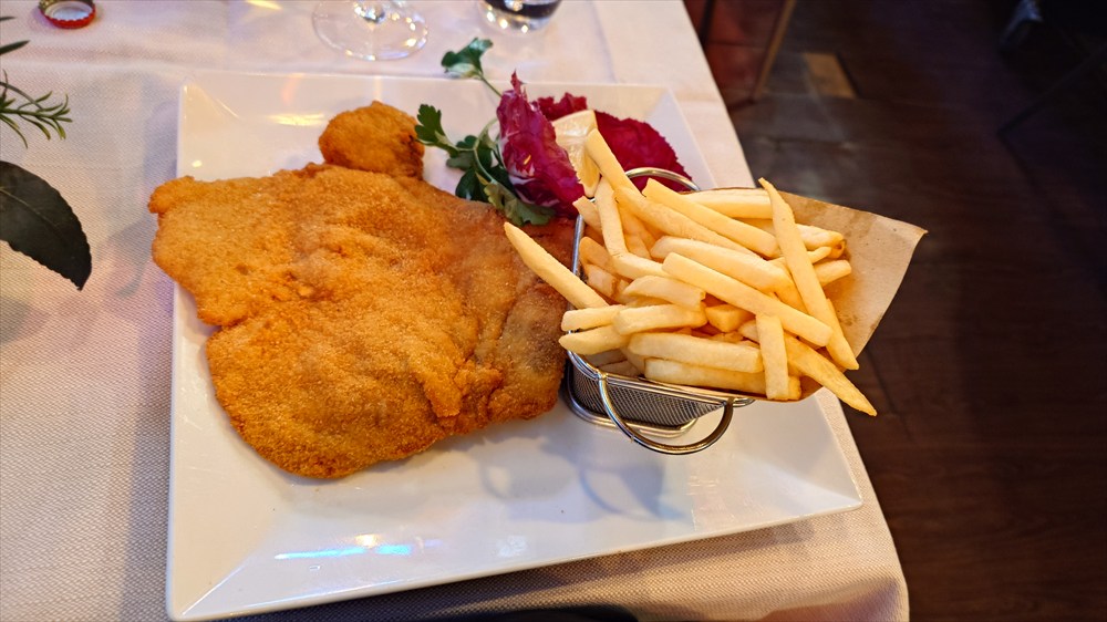 ミラノ風カツレツ(25€)はボリューム満点、サクサクでジューシーだった。